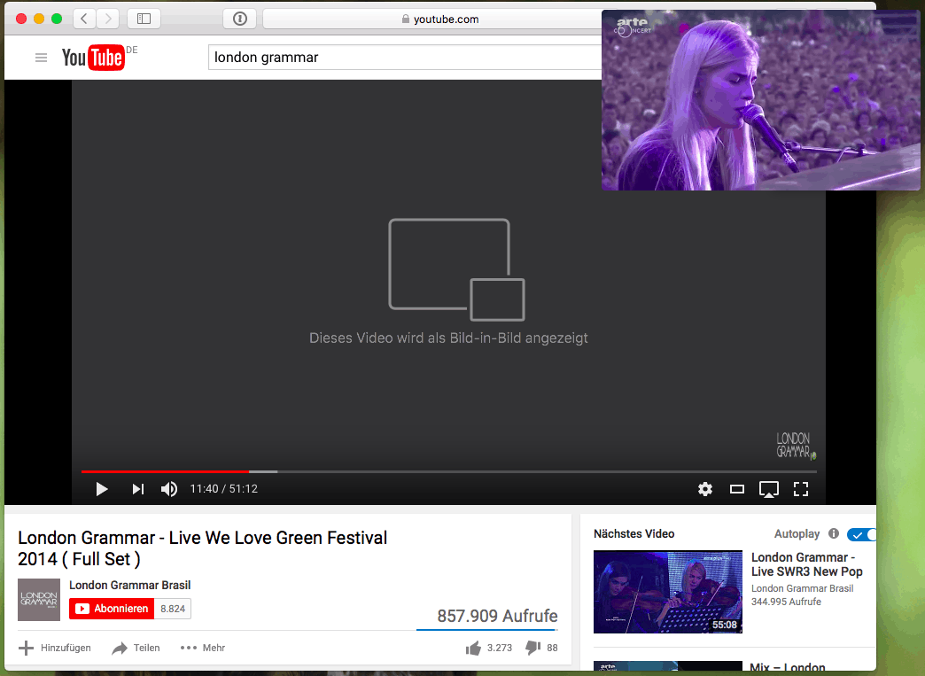 Nur bei YouTube scheint es zu haken. Hier versteckt sich die Funktion, da der Player das nicht aktuell unterstützt, über das Safari Kontextmenü. Das bedeutet auch, dass Bild-in-Bild nur mit Safari funktioniert!