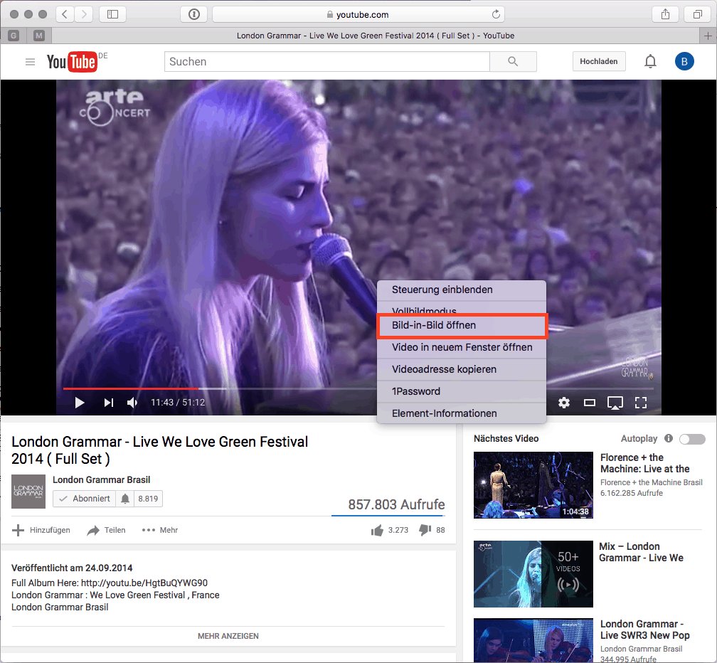 Und so geht’s: Zweimal Rechts-Klicken und im zweiten Kontext-Menü (das von Safari), dann „Bild-in-Bild“ auswählen.